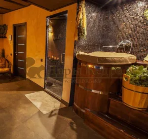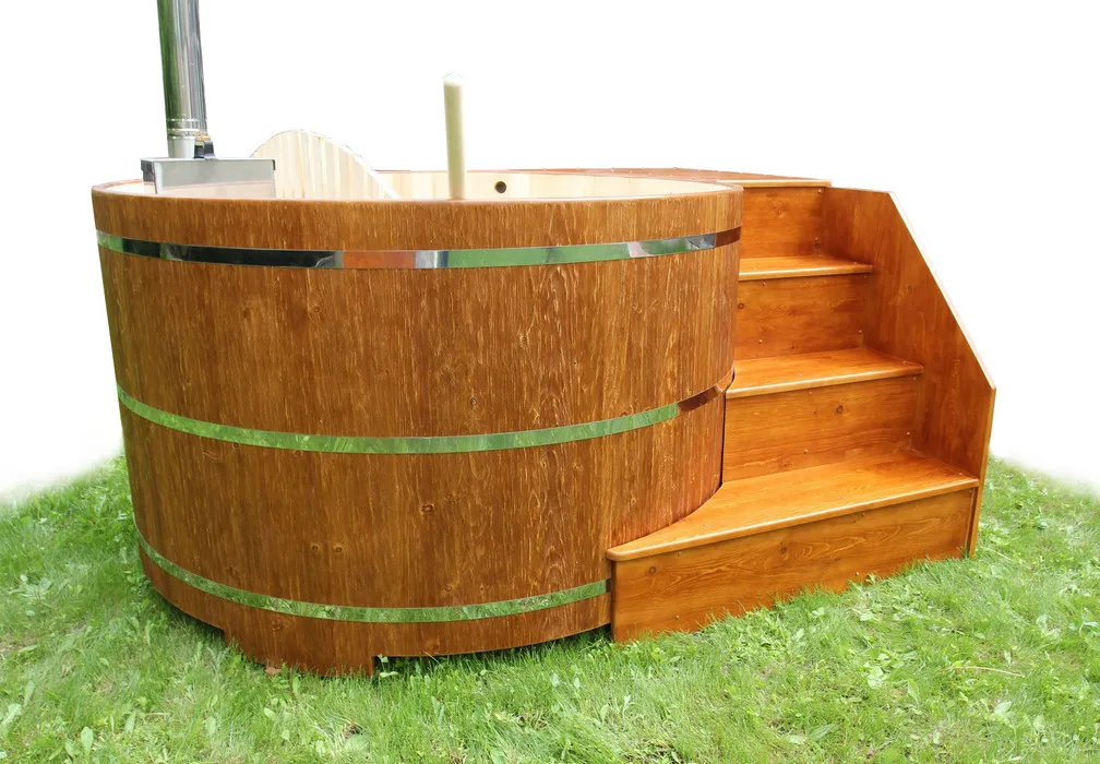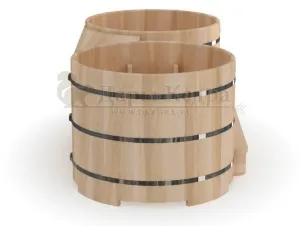 Двойная купель из кедра чаще всего используется в крупных банных комплексах и оздоровительных центрах. Она представляет собой две круглые чаши для воды, в которых люди отдыхают после парения. Между купелями установлен широкий подиум из кедра, по которому могут спускаться и подниматься сразу несколько людей. Для комфортного отдыха купель оснащена лавочками и двумя дополнительными лестницами. За счет стяжных болтов обручи из нержавеющей стали плотно прилегают к кедровой купели. Это позволяет равномерно распределять нагрузку воды и сохранить форму изделия в период эксплуатации. При правильном уходе купель для бани не рассыхается и не подвергается гниению.