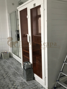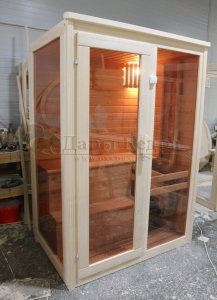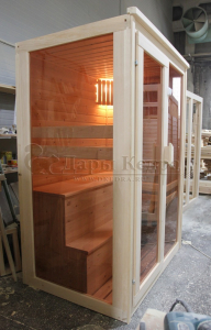 Это специально оборудованная готовая деревянная кабина для сухого и влажного парения. Электропечь нагревает пространство внутри и позволяет сбрызгивать камни водой, слегка увлажняя воздух. Такая процедура позволяет избежать перегрева. Сауна обшита снаружи и внутри кедровой вагонкой и имеет теплоизоляционный слой. Финская сауна с электропечью подойдет, как для домашнего использования, так и для коммерции. Доставляется в разборном виде щитами, собирается по инструкции с помощью шуруповёрта.
