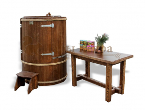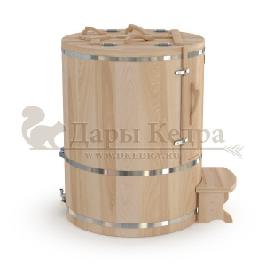 Это круглая фитобочка из кедра увеличенных размеров с толщиной стенок 45 мм. Подходит для людей высокого роста и крупной комплекции. Фитобочка оборудована откидными створками, дверцей и отверстием для головы. Во время парения человек сидит внутри кедровой бочки, а голова находится снаружи. Благодаря этому исключается возможность перегрева. Подлокотники из кедра, встроенные ручки на створках и двери делают эксплуатацию более удобной.
