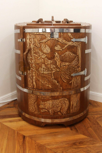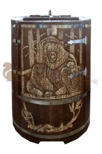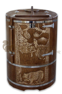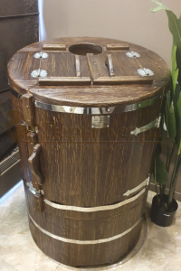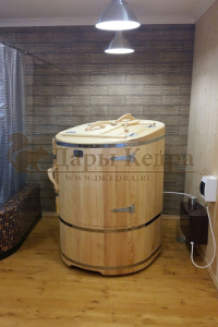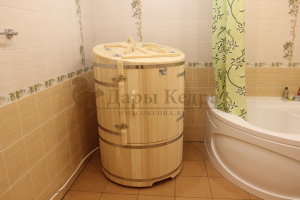 Это круглая фитобочка из кедра увеличенных размеров с толщиной стенок 45 мм. Подходит для людей высокого роста и крупной комплекции. Фитобочка оборудована откидными створками, дверцей и отверстием для головы. Верхний скос изделия делает положение головы более комфортным и улучшает обзор. Во время парения человек сидит внутри кедровой бочки, а голова находится снаружи. Благодаря этому исключается возможность перегрева. Подлокотники из кедра, встроенные ручки на створках и двери делают эксплуатацию более удобной.