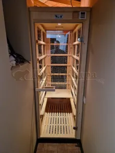 Это специально оборудованная кабина из липы для прогрева тела человека сухим теплом. Воздух в таких парных не нагревается. Инфракрасные лучи воздействуют на тело, равномерно прогревая мышцы, суставы и органы. Карбоновые излучатели, встроенные в стены кабины, обладают мягким прогревом, что полностью исключает возможность ожога. Работает кабина за счет электричества. Компактная одноместная инфракрасная сауна с карбоновыми излучателями подойдет как для домашнего использования, так и для коммерции.