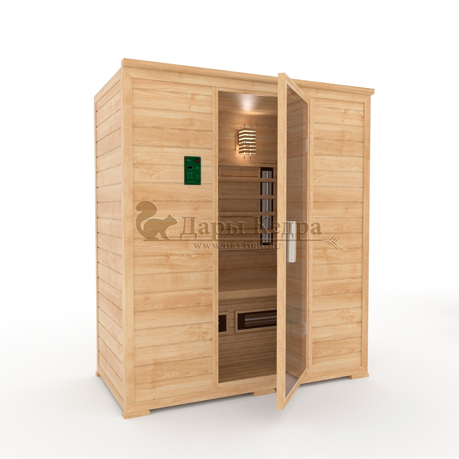 Это специально оборудованная кедровая кабина для прогрева тела человека сухим теплом. Воздух в таких парных не нагревается. Инфракрасные лучи воздействуют на тело, равномерно прогревая мышцы, суставы и органы. Керамические излучатели похожи на лампы, имеют высокую температуру нагрева, поэтому защищены противоожоговыми решетками. Тело человека в таких саунах нагревается интенсивнее. Работает кабина за счет электричества. Трехместная инфракрасная сауна с керамическими излучателями подойдет как для домашнего использования, так и для коммерции.